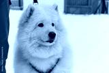 samoyed domestic dog on the snow in a collar on a leash.. isolated animal pet on white background. winter sport sled dog racing