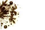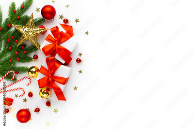 Christmas background with red decorations, baubles, fir tree branches, gift boxes