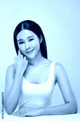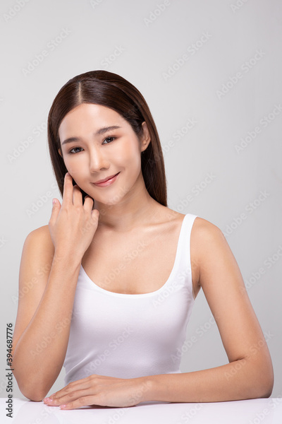 Beautiful Asian young woman touching soft cheek smile with clean and fresh skin Happiness and cheerful with positive emotional,isolated on gray background,Beauty and Cosmetics Concept