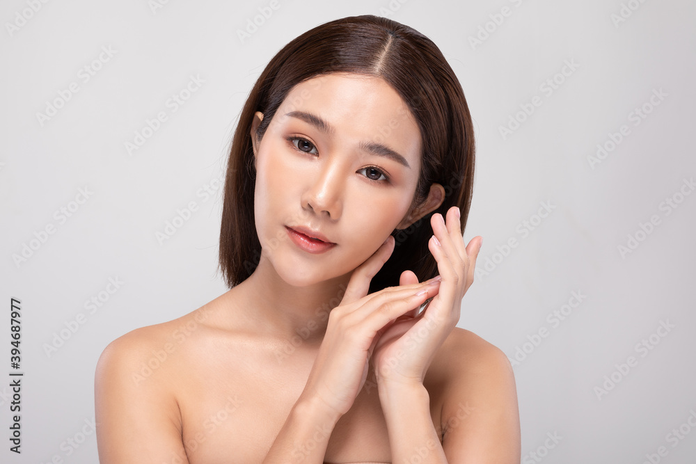 Beautiful Asian young woman holding hands smile with clean and fresh skin Happiness and cheerful with positive emotional,isolated on gray background,Beauty and Cosmetics Concept
