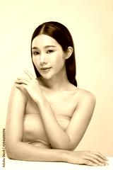 Beautiful Young Asian Woman Looking While Touching Shoulder feeling so happy and cheerful with healthy Clean and Fresh skin,isolated on gray background,Beauty Cosmetology Concept