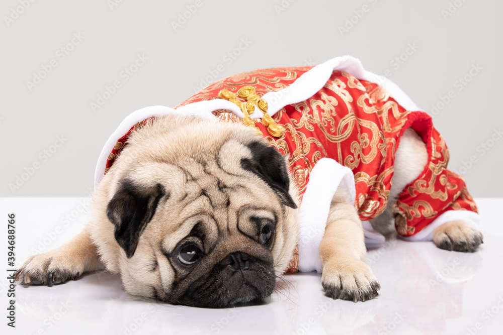 Happy dog pug breed in Chinese New Year costume for Happy and lucky year