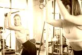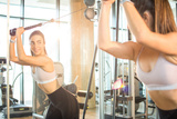 Sporty woman exercise with cable weight machine in gym.
