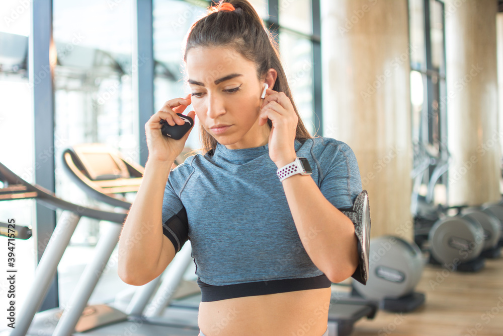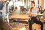 Fit young woman sitting on a fitness machine and exercising with a dumbbell at gym.