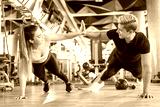 Happy sporty young couple doing push-ups exercise and giving high five each other in gym