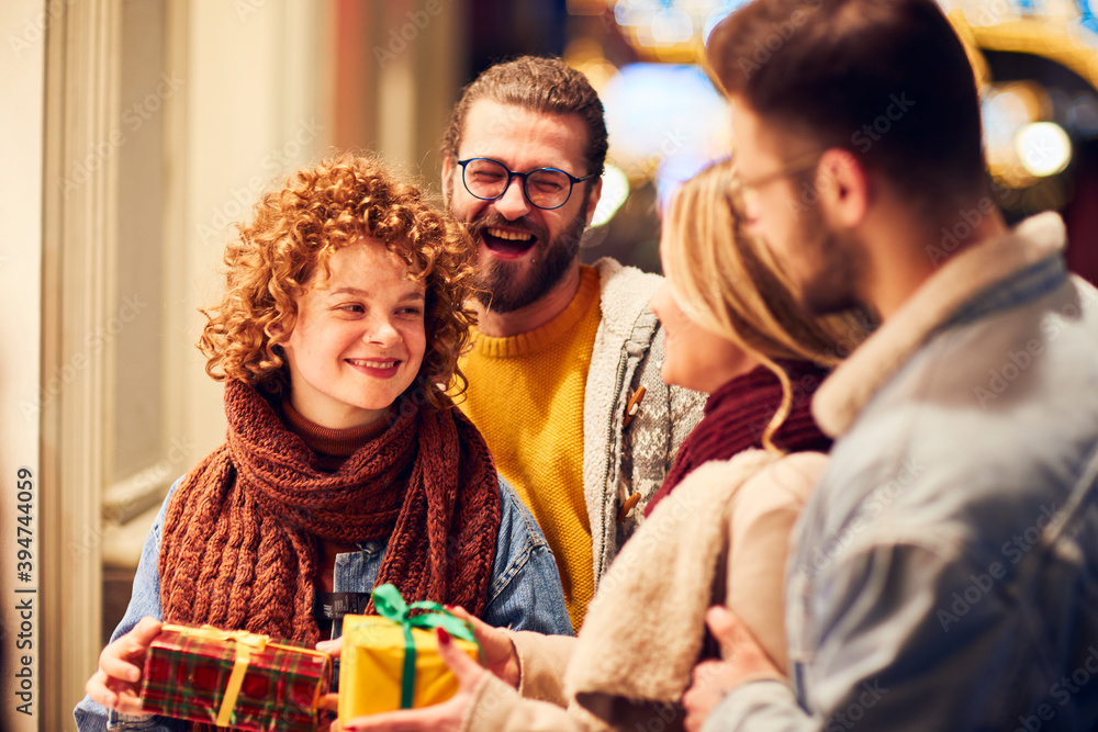 Friends walking on the street with christmas gifts