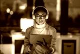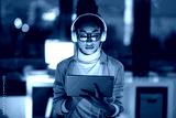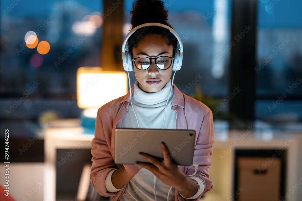 Beautiful young entrepreneur woman using her digital tablet while listening music standing in the office.