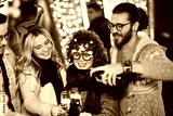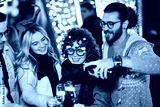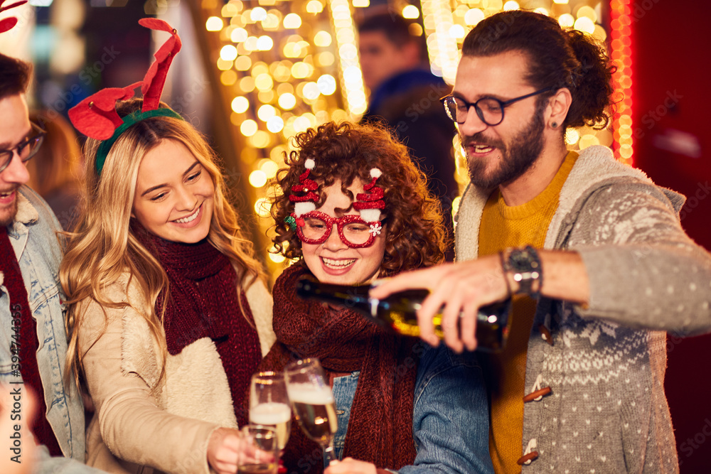 Group of happy friends drinking champagne and celebrating New Year at the street. New year party.