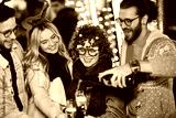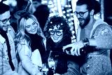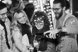 Group of happy friends drinking champagne and celebrating New Year at the street. New year party.