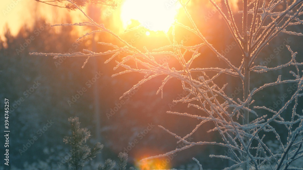 cy frosted tree branches in cool snow winter forest lit by sunshine. Closeup, shallow DOF