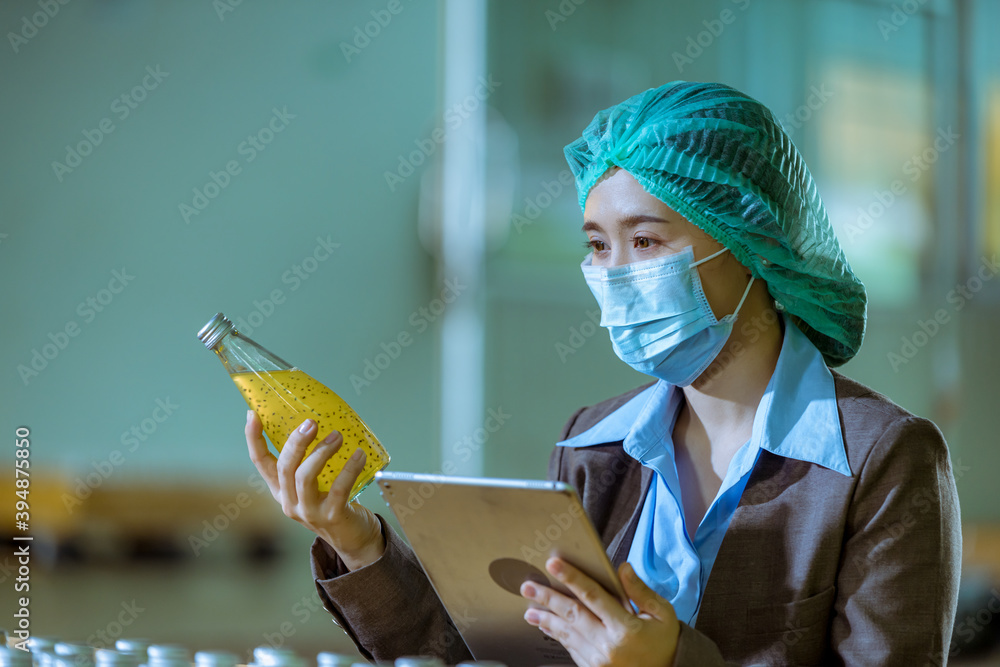 Worker of science in bottle of Basil seed beverage factory wearing safety hat and face mask working