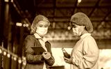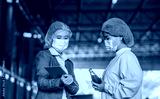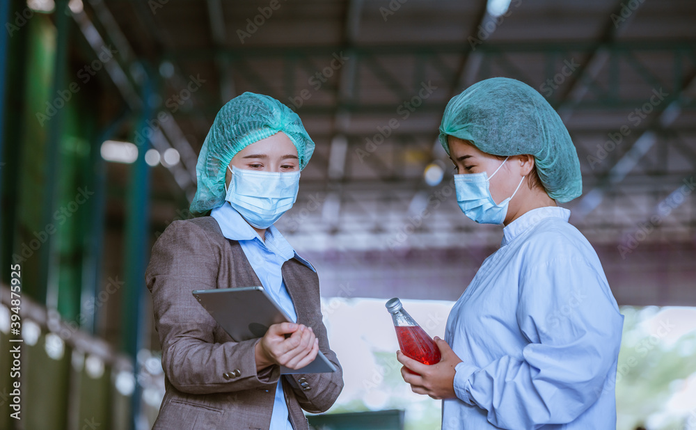 Worker of science in bottle beverage factory wearing safety hat ,face mask discussion and working to check quality of drink Basil seed produce on conveyer before distribution to market business.