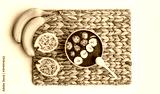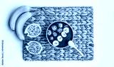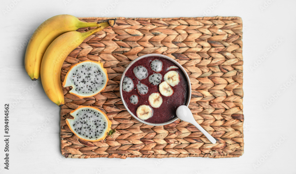 Acai smoothie bowl with fresh pitaya balls and sliced bananas topping on frozen treat. Healthy organic breakfast top view at home.