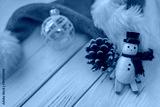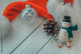 Christmas wooden snowman white wood background with miniature vintage toy, pine cone, glass ball ornament and santa hat for xmas holidays.