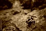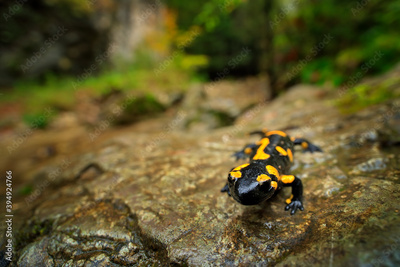 Salamander in the river habitat. Gorgeous Fire Salamander, Salamandra salamandra, spotted amphibian on the grey stone with green moss. Rare animal in the dark forest, wide angle lens, Slovakia, Europe