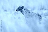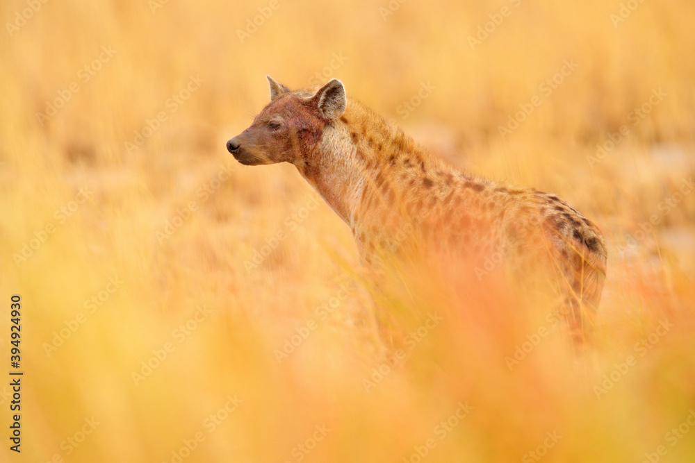 Young hyena pup, evening sunset light. Hyena, dolden grass. Spotted hyena, Crocuta crocuta, angry animal near the water hole, beautiful evening sunset and cub. Animal nature, Okavango, Botswana