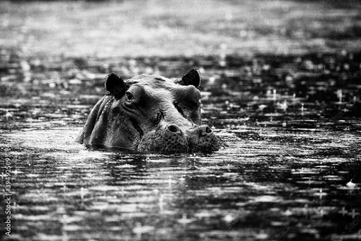 Africa - black and white art. Hippo in the water during rain. Wildlife scene from nature. Big water mammal from Okavango delta, Botswana in Africa. Hippo in the nature habitat.