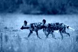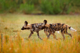 Painted hunting dog on African safari. Wildlife scene from nature. African wild dog, walking in the green grass, Zambia, Africa. Dangerous spotted animal with big ears.