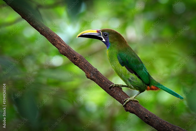 Blue-throated Toucanet, Aulacorhynchus caeruleogularis, green toucan in the nature habitat, mountains in Costa Rica. Wildlife scene from tropic forest. Green bird sitting on the branch.