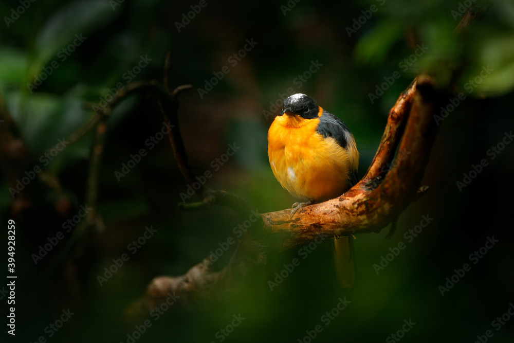 Snowy-crowned robin-chat, Cossypha niveicapilla, orange bird with white cap in the nature forest habitat. Robin sitting on the branch in the green vegation, Angola and Cameroon in Africa.