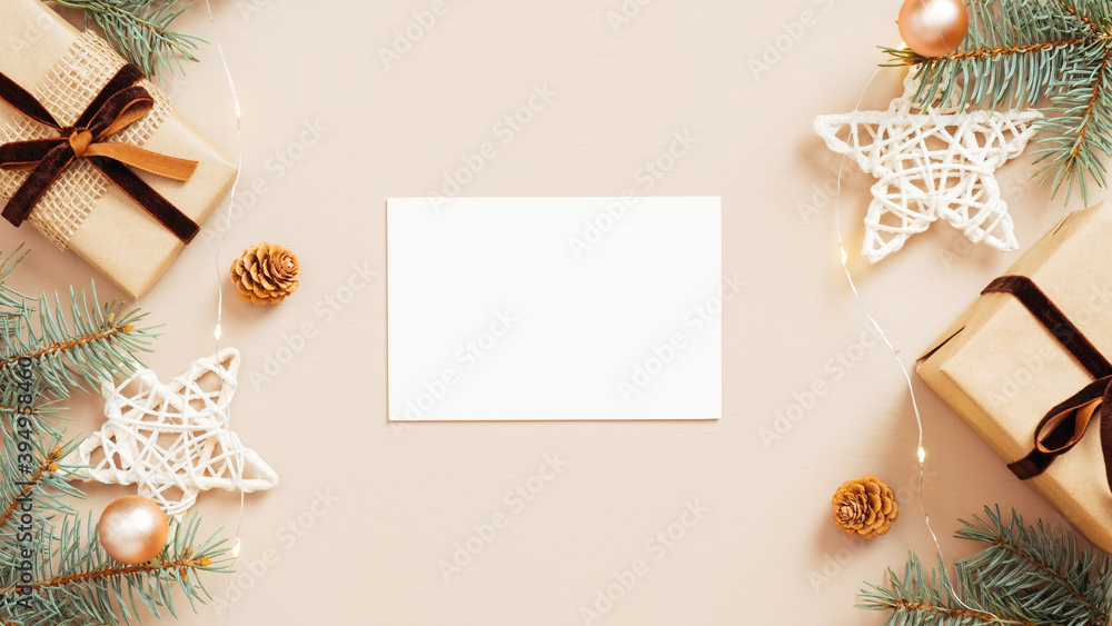 Christmas flat lay composition with empty paper card mockup, gift boxes, stars decoration, fir tree branches on beige background. Cozy home table, hygge style.