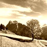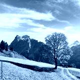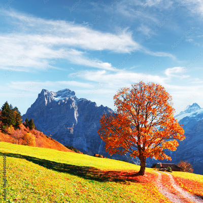 Picturesque autumn landscape with orange tree, green meadow and blue mountains in Grindelwald village in Swiss Alps