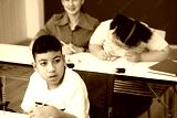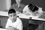 disability boy sitting on wheelchair in classroom special with teacher and AUtism kids education