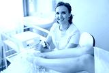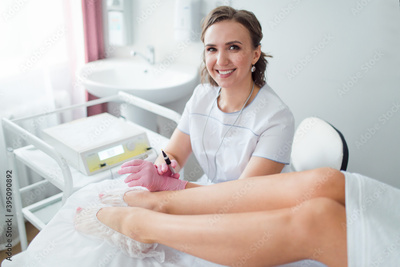 woman cosmetologist, legs electroepilation process professional hair removal procedure