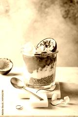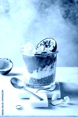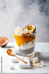 Healthy tropical fruit chia pudding with granola, mango, passion fruit and coconut chips in a glass jar. Vegan healthy breakfast, clean eating.