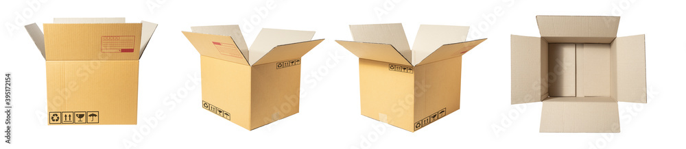collection of open cardboard boxes for postal and EMS deliveries , concepts shopping online, isolated on white background