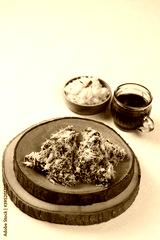 Kue lupis ketan hitam as traditional Indonesian sweet sticky rice dumplings of black glutinous rice with grated or shredded coconut and palm sugar syrup