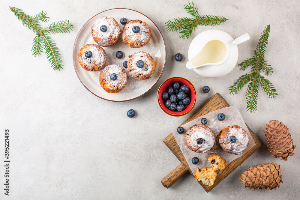 Festive christmas breakfast with blueberry muffins decorated with fresh blueberries and powdered sugar, milk on light grey table , decorated with fir tree branches. Copy space. Top view.