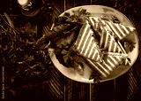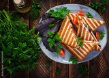 Grilled club sandwich panini with ham, tomato, cheese and leaf mustard. Delicious breakfast or snack. Top view, copy space, overhead