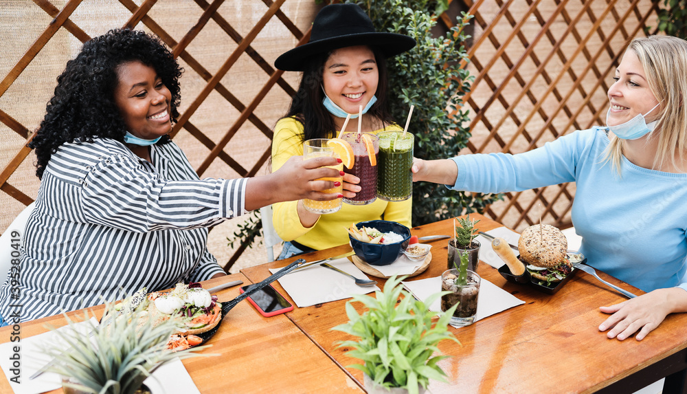 Young women cheering with smoothies during coronavirus outbreak - Girls wearing protective masks at trendy restaurant - Healthy lifestyle and social distance concept - Focus on right female face