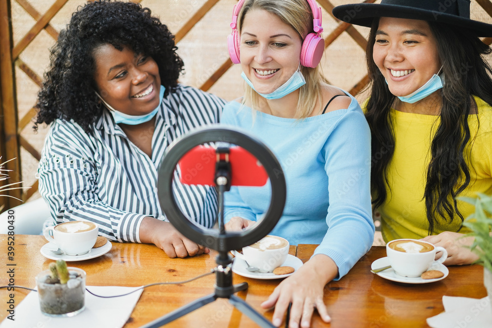 Multiracial girls streaming online using influencer led and phone cam during coronavirus outbreak - Young women wearing safety mask while having fun with technology trend - Focus on center female face