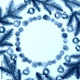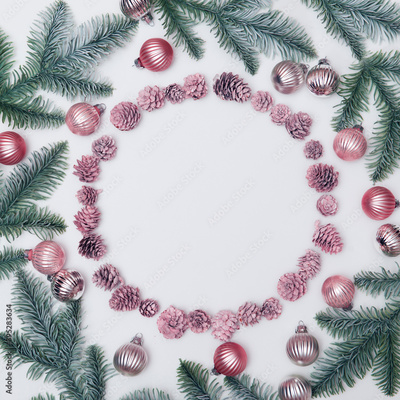Christmas round frame of fir tree branches, decoration cones and balls. Flat lay.