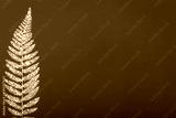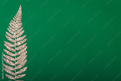 Color christmas background with golden glitters covered fern branch, flat lay, copy space