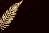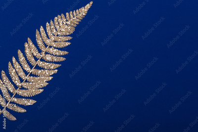 Color christmas background with golden glitters covered fern branch, flat lay, copy space