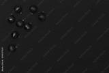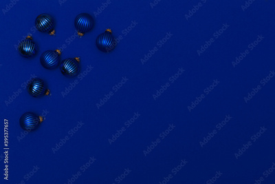 dark blue christmas decoration balls on color background. Copy space, flat lay, top view.
