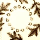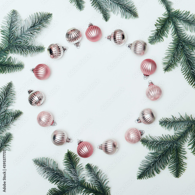 Christmas composition. Christmas decorations on white background. round frame for text. Flat lay, top view, copy space