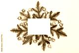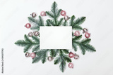 Christmas composition. Empty greeting card on fir branches and decor background. Flat lay, top view, copy space