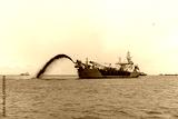 Vessel engaged in dredging. Dredger working at sea. Ship excavating material from a water environment.