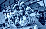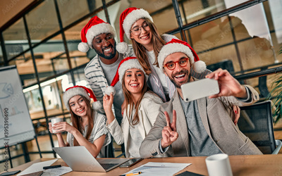 Happy New Year and Merry Christmas! Multiracial young creative people in Santa hats celebrate a holiday in a modern office and take a selfie with a smartphone on their last working day.