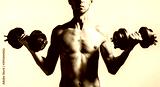 Man holding dumbbell in hand. Skinny guy hold dumbbells up in hands. A thin man in sports with dumbbells.Black and white