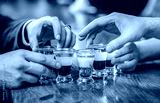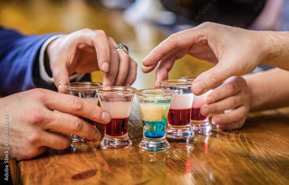 Friends drink shot or liqueur. Five glasses of alcohol.Tequila shots, vodka, whisky, rum. Cocktail at the nightclub. Group friends tequila shot glasses in bar. Male hands glasses of shot or liqueur