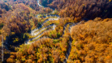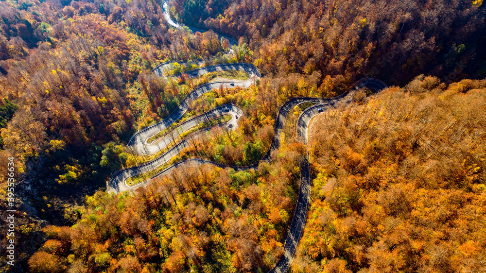 Aerial view of curvy road in beautiful autumn forest at sunset. Top view of roadway