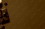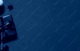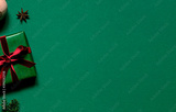 Christmas or New Year concept frame with a gift box and red velvet ribbon on the dark green background. Top view. Copy space.