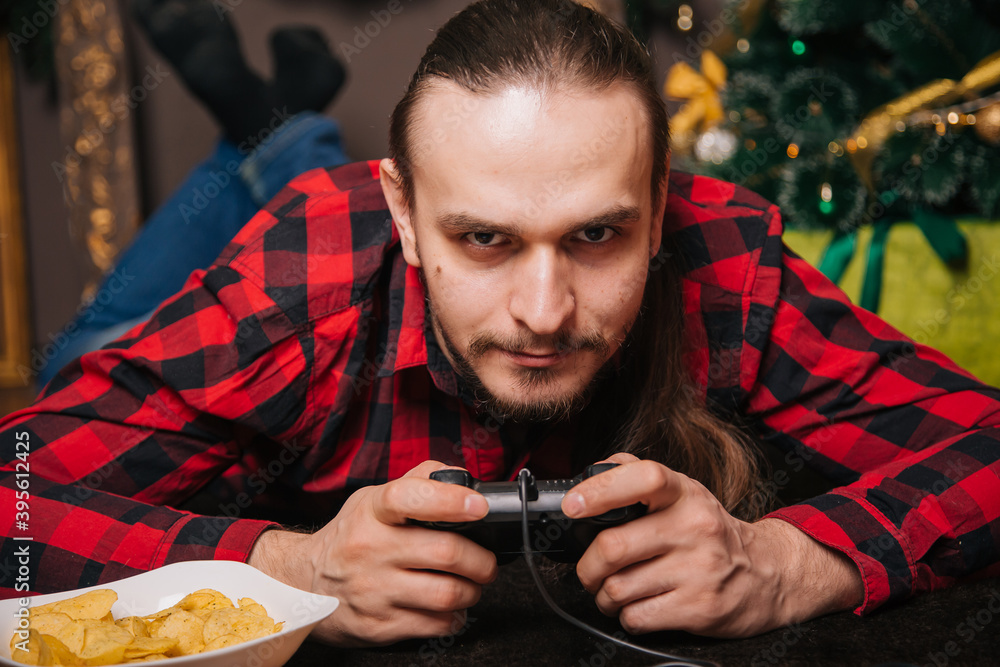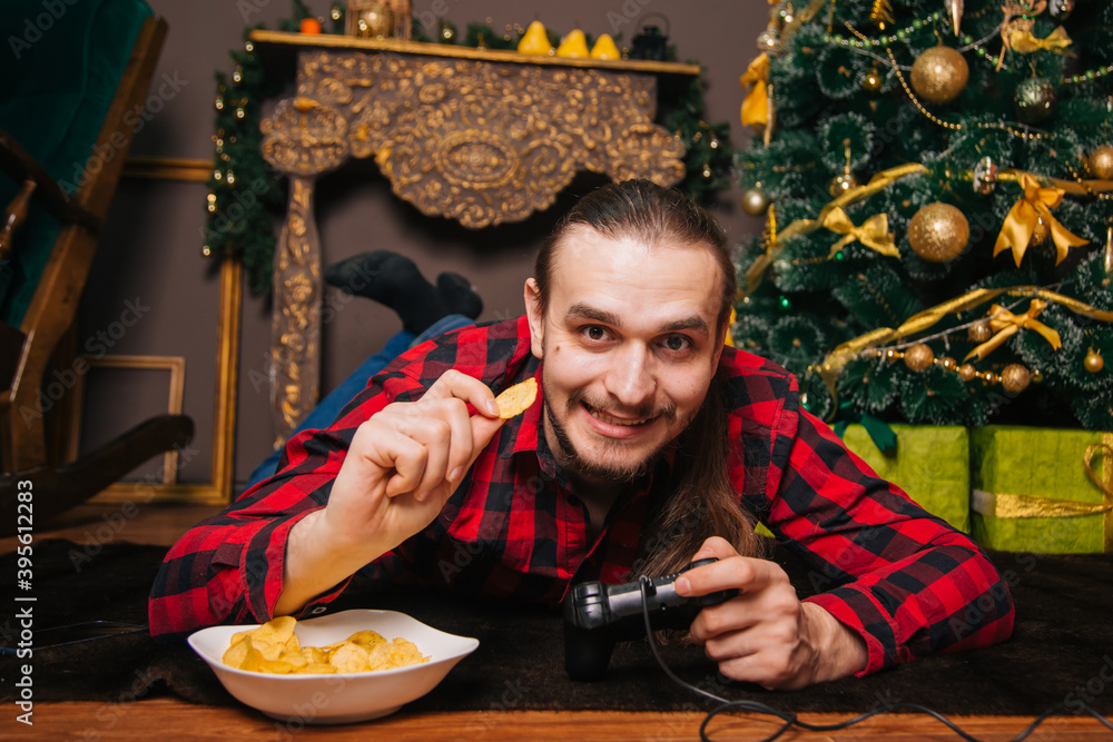 A man with a beard and mustache in a red checkered shirt is playing with a joystick. Eating chips. Against the background of the New Year tree. New year decoration.