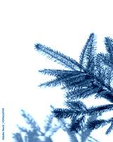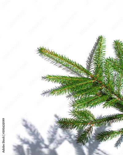 Branches of fir on the bright white background. Concept Christmas or New Year frame. Copy space