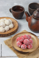 Moci merah putih. Red and White Mochi or moci cake. One of traditional snack from Indonesia. Made from glutinous rice flour with sugar and roasted peanut filling.